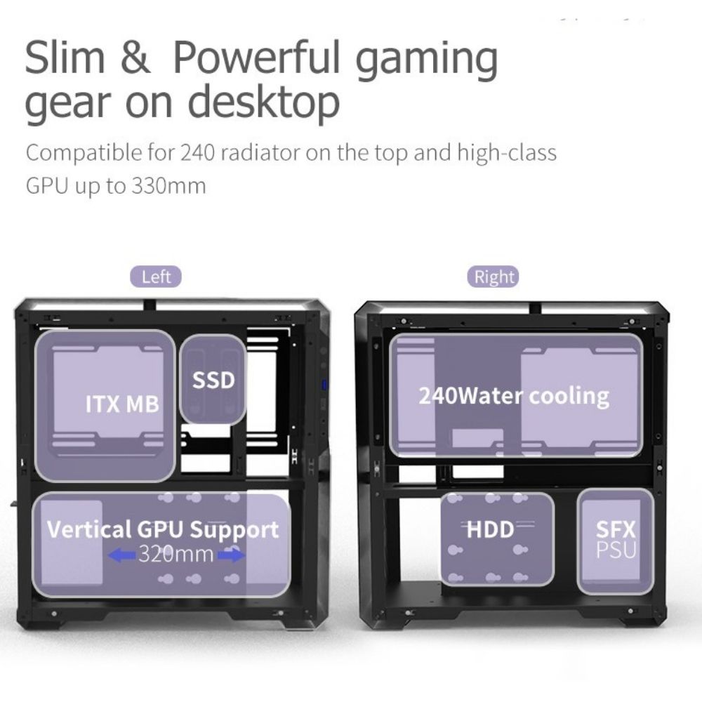 – The unique design fits up to 320mm standard GPU, 240mm radiator, and standard PSU